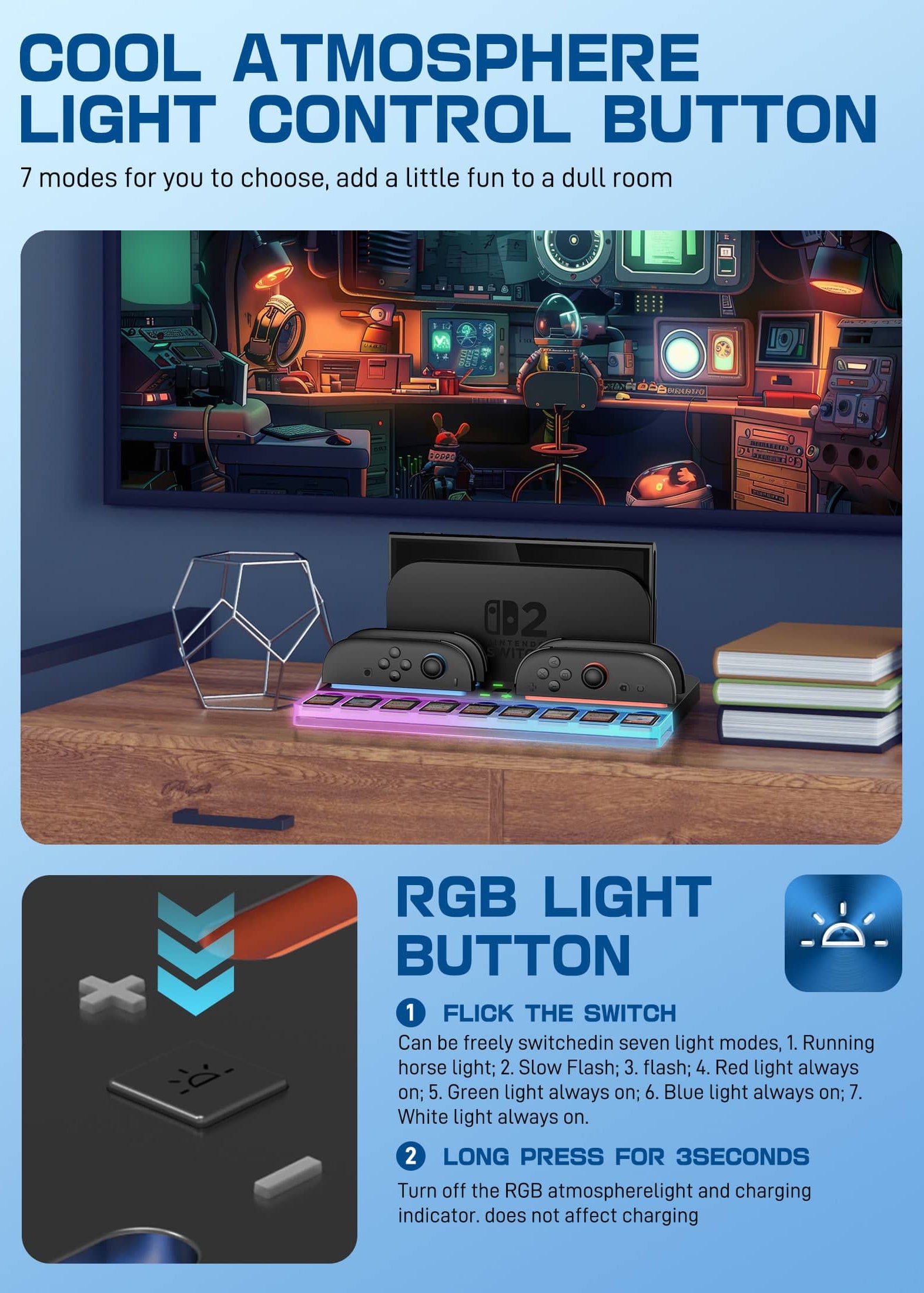 This all-in-one charging and storage dock keeps your Nintendo setup organized and ready for action. It charges up to four controllers simultaneously while neatly storing your console and up to nine game cartridges. With smart LED indicators, ambient lighting, and built-in overcharge protection, it brings both convenience and style to your gaming space.