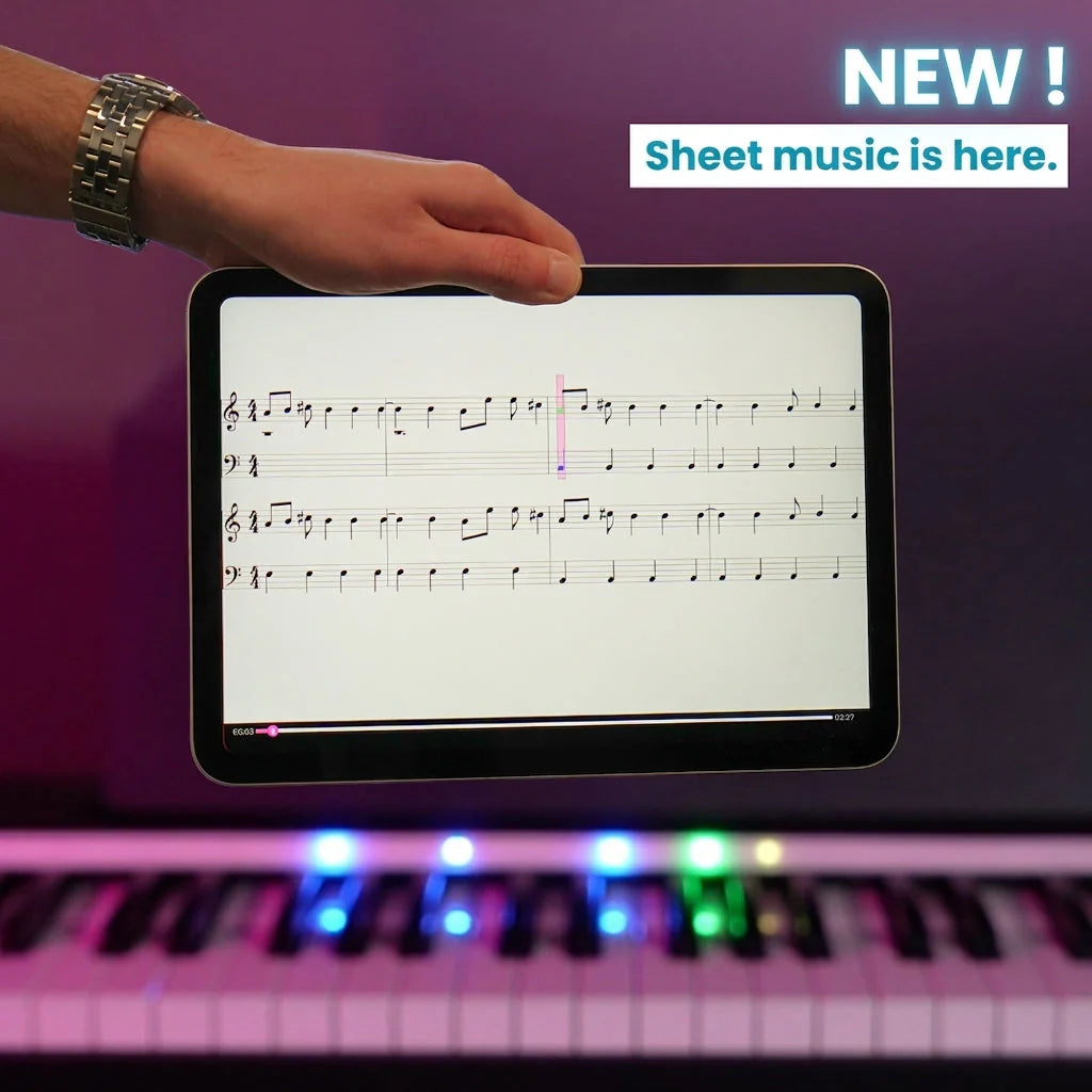 LED strip lights up key by key to guide you as you play—detects mistakes and waits for the right keys before advancing.
